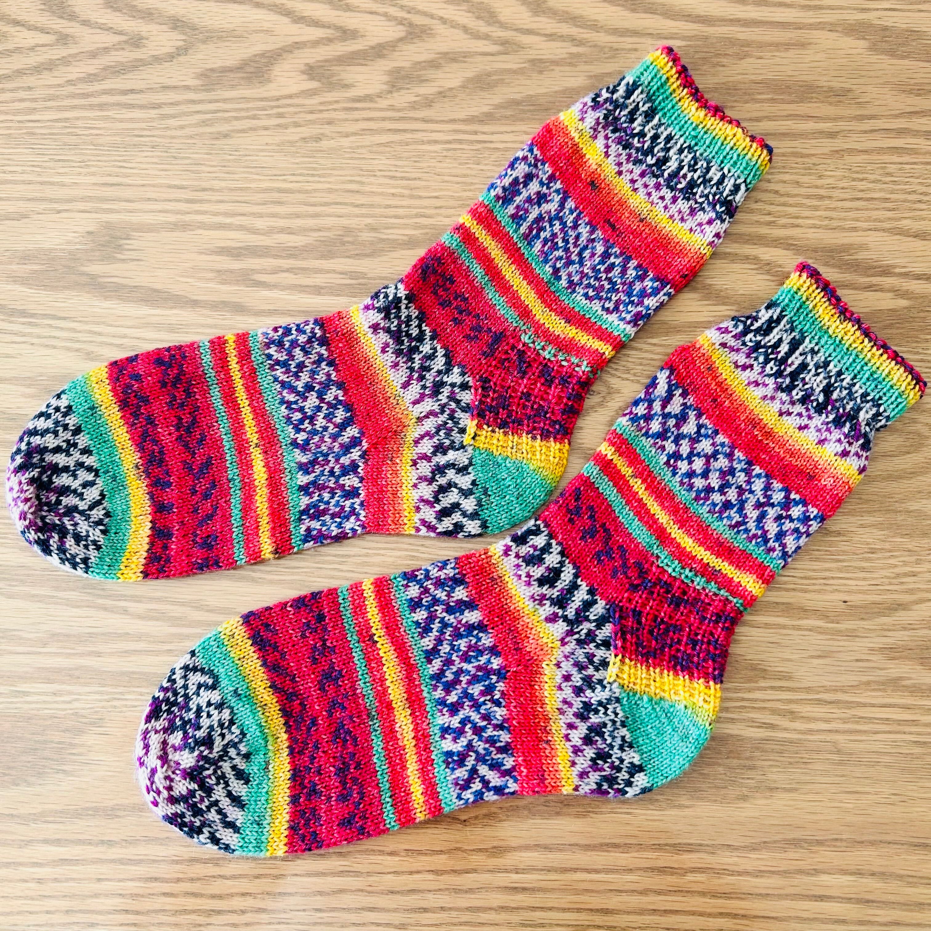 ■ 商品について思わず気分が明るくなる、ポップでカラフルな手編みソックスです。色とりどりのストライプと模様が自然に現れる毛糸を使い、左右で少...
