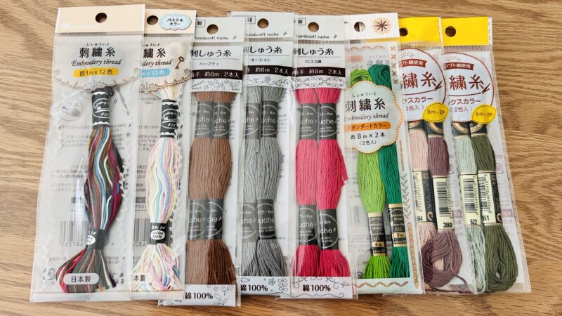 刺繍糸もセリアで購入。お店にあった色合い全部ゲットしてきたんですが、他の店舗にいけばもっと揃いそうな感じがします。