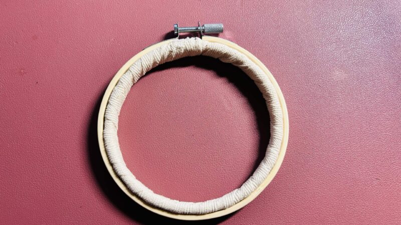こちらの枠もセリアで購入。直径を計ると11.5cmぐらいでした。使ってみたところ布が滑りやすかったので家にあった布テープみたいなものを内枠に巻き付けてみました。