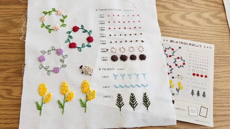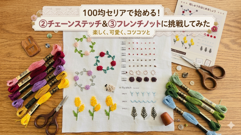 前回初めて挑戦してみたセリアの刺繍図案①に引き続き②のチェーンステッチ&③のフレンチノットステッチに挑戦してみました